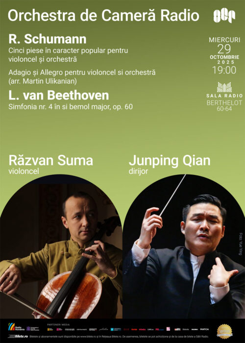 Miercuri, 29 octombrie 2025 (de la 19.00), vă invităm la Sala Radio la o întâlnire cu muzica semnată de doi dintre cei mai mari compozitori germani: Beethoven (Simfonia nr. 4) și Schumann (Cinci piese în caracter popular pentru violoncel și orchestră și Adagio și Allegro pentru violoncel si orchestră – aranjament realizat de Martin Ulikanian).